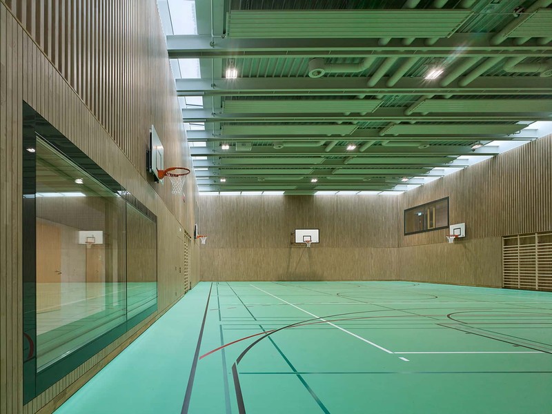 Die Schule liegt darüber, mit peripheren Erschliessungen, die Nutzerinnen und Nutzer zum Licht führen. Die beiden Sporthallen sind innenliegend angeordnet, wodurch die Fassaden für Unterrichtsbereiche frei bleiben.