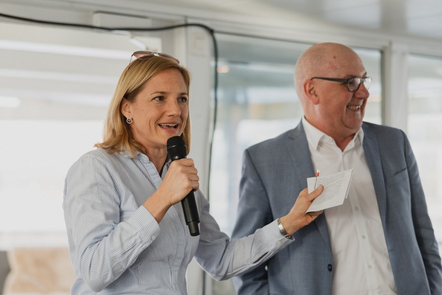 Im Anschluss an den exklusiven Blick hinter die Kulissen der Schweizerischen Rheinhäfen ging es für die geladenen Gäste aufs Wasser. Während einer Schifffahrt durch die Basler Hafenanlagen bot sich Gelegenheit zum Austausch und Networking.