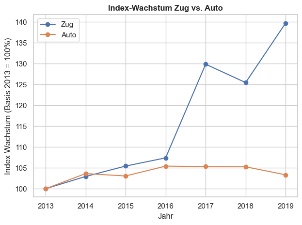 Personen, die den Gotthard mit der Bahn oder im Auto passieren, indexiert auf das Jahr 2013: Die Zahl der Bahnpassagiere hat von 2013 bis 2019 um rund 40 Prozent zugenommen, die Zahl der Personen im Auto knapp fünf Prozent. © Ann Hesse
