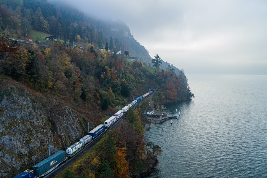 Un train de SBB Cargo International entre Flüelen et Sisikon © SBB CFF FFS