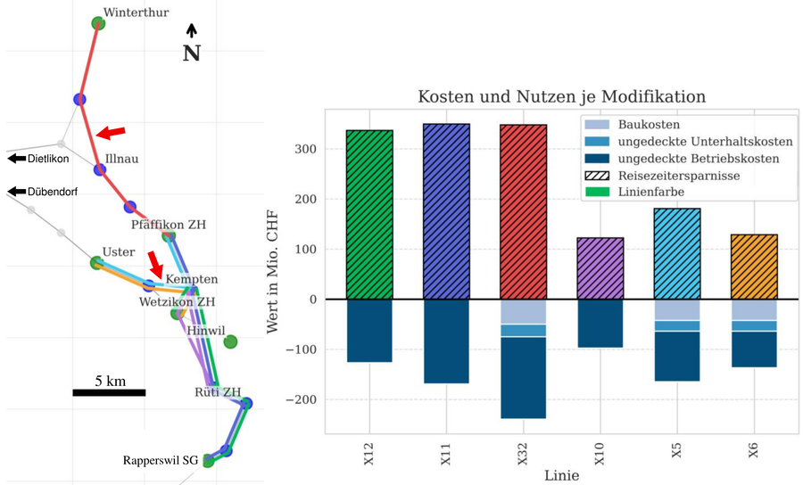 Figure 3 : La colonne rouge indique les avantages supplémentaires pour la période de 2050 à 2100, calculés par l’outil pour la liaison directe entre Kemptthal et Illnau, en tant que moyenne des 100 scénarios simulés. Afin de quantifier les avantages, chaque gain de temps de trajet est associé à une valeur monétaire. Les colonnes bleues situées en dessous indiquent les coûts actualisés pour la construction, l’entretien et l’exploitation pour chaque nouvelle liaison directe et pour la même période de 50 ans. Les flèches rouges signalent les tronçons à construire (courbes de raccordement). © Silvano Fuchs