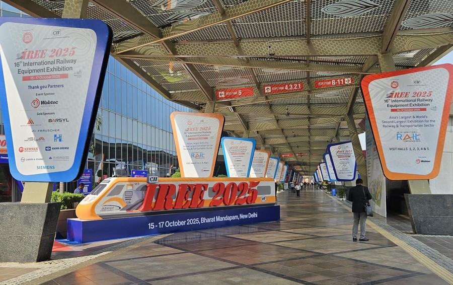 Entrée de l’IREE 2025 à New Delhi, le plus grand salon ferroviaire d’Asie du Sud.