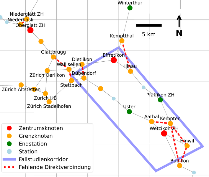 Für seine Arbeit wählte Silvano Fuchs exemplarisch einen Planungsperimeter entlang der Bahnstrecke Dübendorf – Hinwil im Kanton Zürich (vgl. Grafik 01). An diesem Fallbeispiel lässt sich anschaulich darstellen, wie das Planungstool eingesetzt wird: In einem ersten Schritt sucht der Algorithmus nach möglichen Ausbauoptionen für das Schienennetz, wobei die Wirtschaftlichkeit in dieser Phase noch keine Rolle spielt.