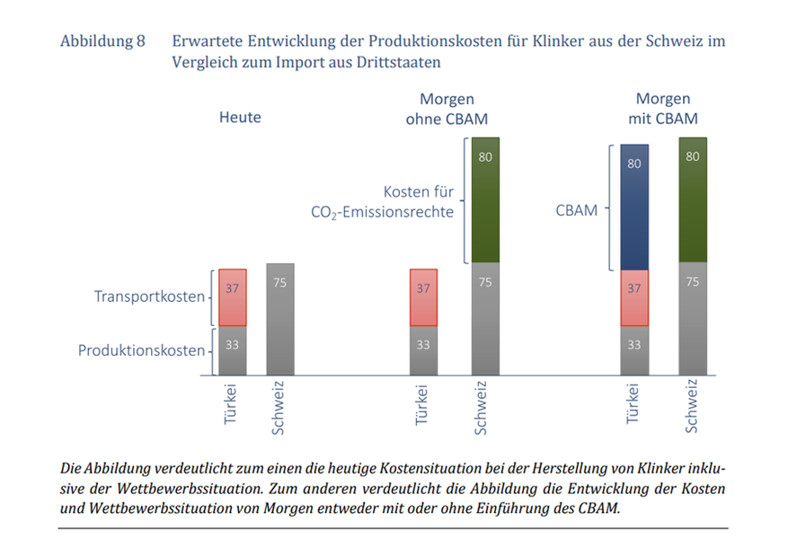 L’illustration montre d’une part la situation actuelle des coûts de fabrication du clinker, y compris la situation concurrentielle. D’autre part, elle illustre l’évolution des coûts et de la situation concurrentielle de demain, avec ou sans introduction du CBAM. Source : Non-Mise en œuvre du CBAM - Implications pour l'industrie du ciment et l'environnement (en allemand) © Polynomics 2024