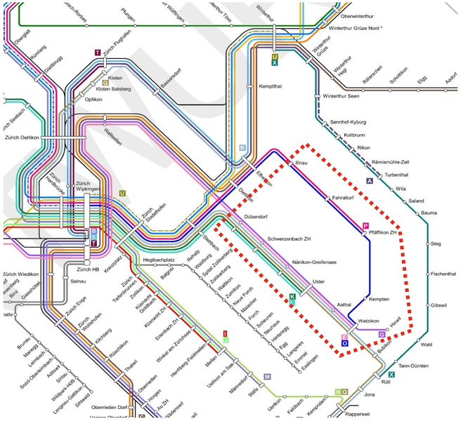 Figure 1 : La liaison ferroviaire entre Dübendorf et Hinwil est au cœur des travaux de Silvano Fuchs (le périmètre de l’étude est représenté par la ligne rouge en pointillés). © Silvano Fuchs