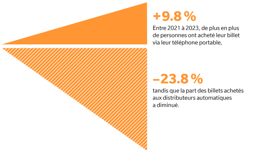 En outre, nous jetons un coup d’œil sur le transport de marchandises, examinons l’évolution du trafic de marchandises à travers les Alpes et analysons les flux de marchandises dans le trafic de transit. Comme d’habitude, les transports en chiffres abordent l’importance économique des transports publics. Nous examinons le financement de l’exploitation et de l’infrastructure des routes nationales et du réseau ferroviaire en Suisse. Par ailleurs, en observant l’évolution des ventes des canaux de vente des TP, nous constatons que de plus en plus de personnes achètent leurs titres de transport de manière numérique, directement sur leur téléphone portable.